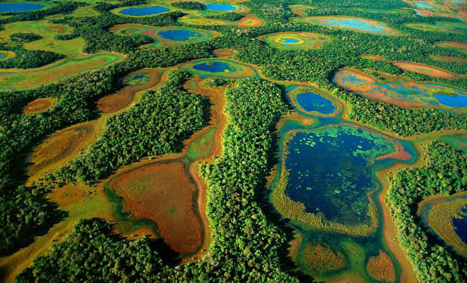 Was einst die portugiesischen Kolonialbeamten als Pantanal - "Morast" - bezeichneten, wird von den gegenwärtigen Bewohnern des Dreiländerecks Brasilien, Bolivien und Paraguay als "Garten Eden" angesehen: 180.000 qkm grenzübergreifende Süßwasserwildnis mit regengrünem Feuchtwald, darin eine Faunenvielfalt von rund 240 Arten an Fischen, 70 an Amphibien und Reptilien, 650 an Vögeln sowie 80 an großen Säugetieren, darunter selten gewordene Spezies wie Jaguar, Puma, Ozelot, Tapir und Riesenflussotter - die tierreichste Region beider Amerikas und außerdem Heimat von mehr als 1700 Pflanzenarten.